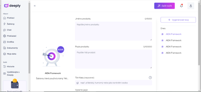 1. Textový modul. Deeply například obsahuje textový modul, AIDA Framework pro AI tvorbu, který za vás vygeneruje dokonalý popisný text. Hodí se tedy výborně k popisu vašeho produktu, to vše navíc v češtině. V Deeply se můžete i zvolit tón hlasu, jehož nastavením ovlivníte generovaný výstup.